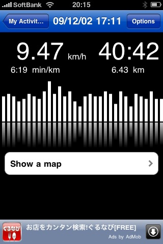 この左上の9.47km/hは平均スピード。右上の40:42は走行時間。右下の6.43kmは走行距離。左下の6:19min/kmは1km走行にかかった時間。その下の棒グラフがペース配分の奇跡である。そして、その下の「Show a map」をタップすると・・・