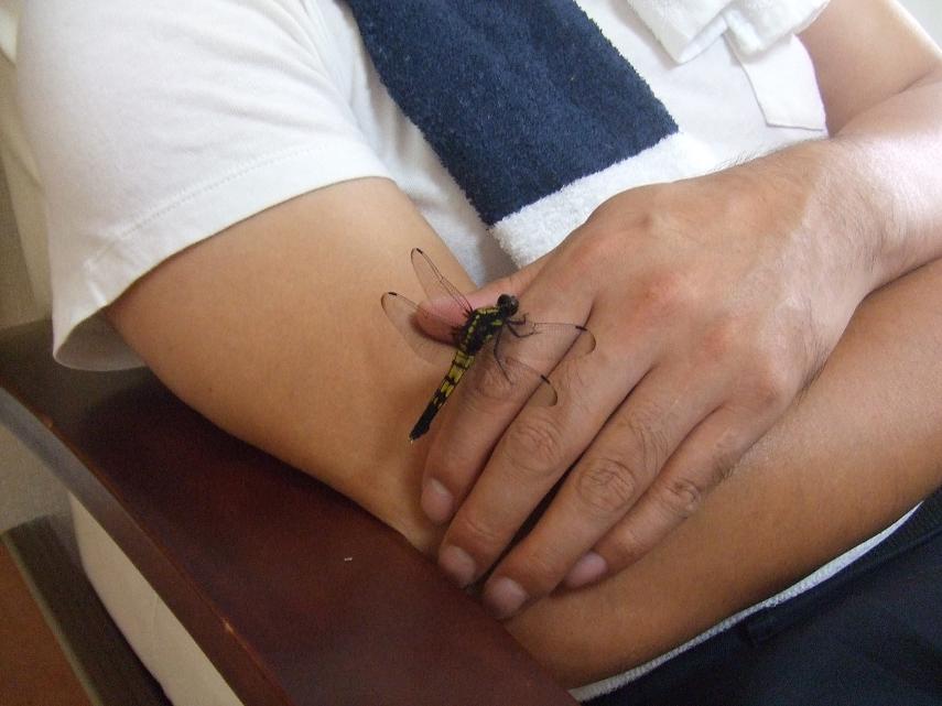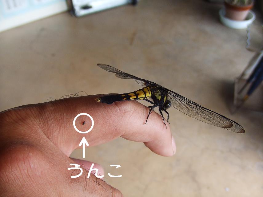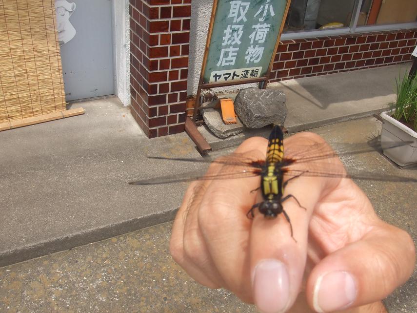 日中、仕事場の米屋の店内に「ブーン。バタバタ・・・」という音と共に、何か黒い昆虫が・・・。何かと思いきや、トンボでした。大きかったので、オニヤンマかと思い捕獲を試み、成功!しかし、今度はオイラの指に停まったまま動かなくなってしまった!!