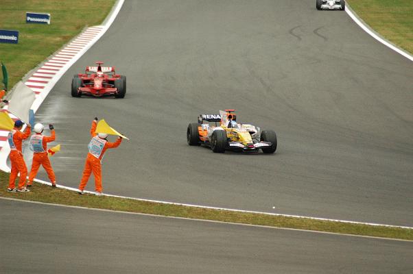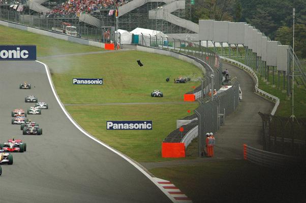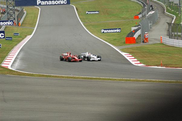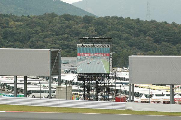 ついにこの日がやってきた!!初のF1観戦。昨年に引き続き富士スピードウェイ(以下FSWと呼ぶ)での開催との事なので、思い切って企画しチケットを申し込んだところ、見事に当選!今回はE席(コカ・コーラコーナー)での観戦となりました。心配なのは去年のトラブルである。渋滞によりスタート時間に間に合わなかった・・・ひどい人はたどり着けないなんて人も居たらしい。。。と言う事で、決勝当日(仕事の都合により、予選等は見れず・・)は、群馬県前橋市を5時に出発。関越~圏央道~中央道~富士五湖道路~須走北A駐車場のコース。途中中央道で多少の渋滞が有ったが、丁度八ヶ岳辺りの紅葉シーズンとぶつかったらしい。しかしながらその渋滞も大したことなく、スムーズに駐車場に到着。チケットライドシステムにより車でのFSWへの乗り入れは出来ない為、数箇所有る駐車場からのバス輸送となる。バスも渋滞せずに無事9時過ぎにFSWに到着。そこから席まで歩きました~。30分位歩いたでしょうか・・・。駐車場の場所を裾野東・裾野西A・B・CにしていればE席まで近かったみたい。。。でも申し込む時はまだ見取り図が公開されていなかったからな~。ま、サーキットを見て歩けたから良かったかな。