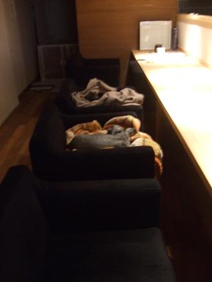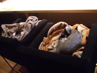 家を新築して3週間が過ぎた。マンション暮らしの時は、床座でソファーなんてものは置いていなかった。勤務先である米屋にはWasabi&Uzulla専用(?)のソファーが有る。そこで日中を過ごしていた彼女らはカーペットを敷いていない床の上は落ち着かないらしい。オイラとカミさんがソファーに座っていると、Wasabiは必ず膝の上に乗せろと催促する。Uzullaはファンヒーターのまん前のクッションの上。膝の上のWasabiはだんだん重くなるし、Uzullaは焦げそうだし・・・。で、結局こんな感じで過ごしています↓↓。
