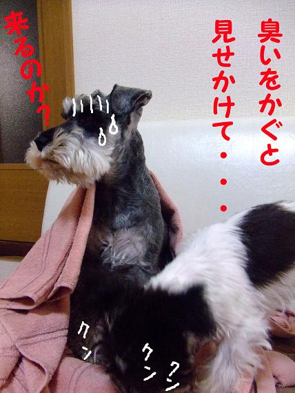 Uzullaが4ヶ月を迎え、序々にであるがトイレをトイレシートの上に行って出来る様になってきたため、一緒に寝てみようという事になった・・・。オイラには一抹の不安が有ったんです。Wasabiは必ずカミさんの布団の中でないと寝ないんです。まあ、小さい頃からカミさんと居る時間が長いという事も要因の一つではあったんだと思うけど、今回のUzullaも状況は同じ。。。不安にかられながらも、刻一刻と時間は過ぎていきます。早くから晩酌していたオイラは、19時には布団に入った。。。WasabiもUzullaも来ない。。。Wasabiはカミさんの膝の上。Uzullaはファンヒーターのまん前でうたた寝。時間も早いし、まあ仕方ないか・・・。爆睡する事1時間半。遂にカミさんは布団に・・・当然の如くWasabiも布団に・・・Uzullaはまだうたた寝してる。このままでは、UzullaもWasabiのいるカミさんの布団に行ってしまう・・・。そうだ!!ここで一旦散歩につれていこう!!一旦眠気をリセットして、戻ったらまずWasabiをオイラの布団に押し込んでUzullaも押し込んでしまおう。Wasabiが居ればUzullaも大人しくしてるだろう・・・と。・・・そしてWasabiとUzullaを連れて散歩に出、2頭を連れての散歩も慣れたもんだと気分良く戻り作戦実行!!嫌がるWasabiを無理やり布団の中に・・・(Wasabiは気を遣って暫くは一緒に寝てくれるんですよん