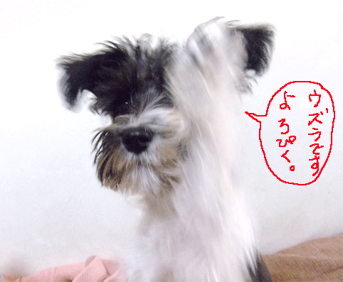 彼女がUzullaです。オイラの次女です。これでもミニチュア・シュナウザーです。今日現在4ヶ月。今日が4ヶ月目の誕生日(?)です。カラーは珍しいホワイト&ブラック。小さくてやんちゃな甘えん坊です。