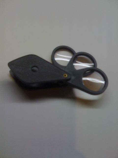 ダイソーの拡大鏡。もち100円。ポケットにも入るし、倍率が3段階に選べるので便利である。