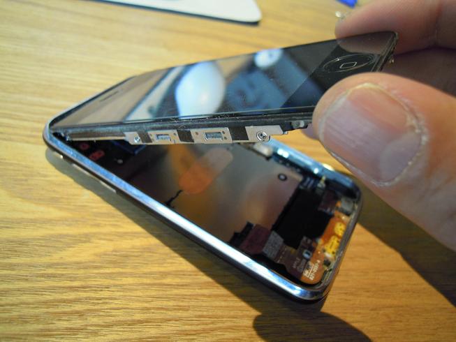 2)ネジが外れたら、吸盤でタッチパネル部を引き上げ外す(ドライバー等で無理にこじ開けると、液晶を損傷する事が有り)。引き上げた時ドックコネクタと反対の上の方にコネクタが3カ所あるので注意しなければならない。
