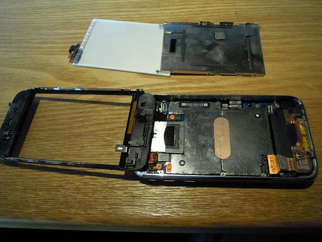 4)背面部と液晶部の二つに分かれたiPhoneの液晶部のメタルフレーム脇の片側2本と逆側3本と液晶コネクタ右隅のネジを外す。メタルフレームと液晶パネルを外す。(ここも無理をすると液晶が損傷します。おいらは、液晶交換なので、無理矢理はずしました)