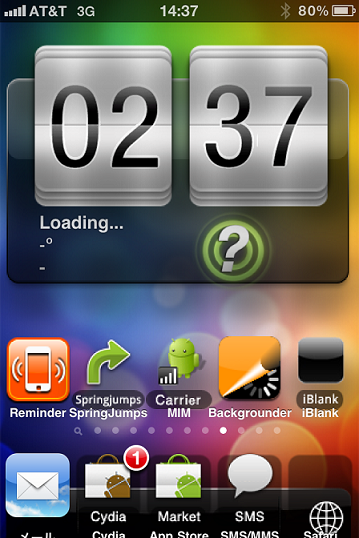 HTCのandroid風のホーム画面。ロックをかけると「iPhone Rocked」と効果音が鳴る。アイコンの配置もDock以外は全て下のみに配置。これも「脱獄」のなせる業。通常は左上からしか配置が出来ない。